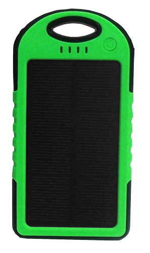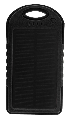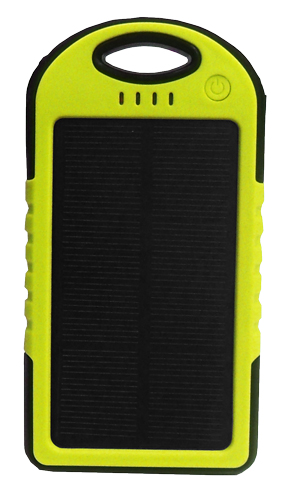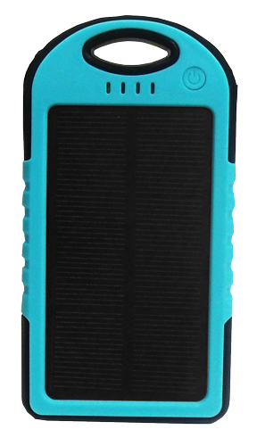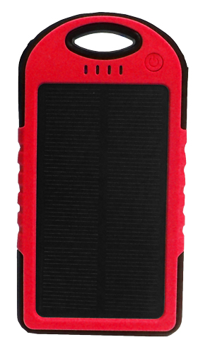 Waterproof Solar Power Bank. Measuring 142 x 75 x 13.6 mm in size, made of Environmentally friendly Silica Gel, ABS, and PC material with rubber paint surface process. It has a battery capacity of 5000mAh. Suitable for all Mobile Phones/ GPS devices/ Cameras etc., and comes with a carabiner.