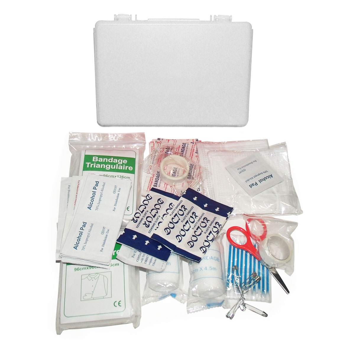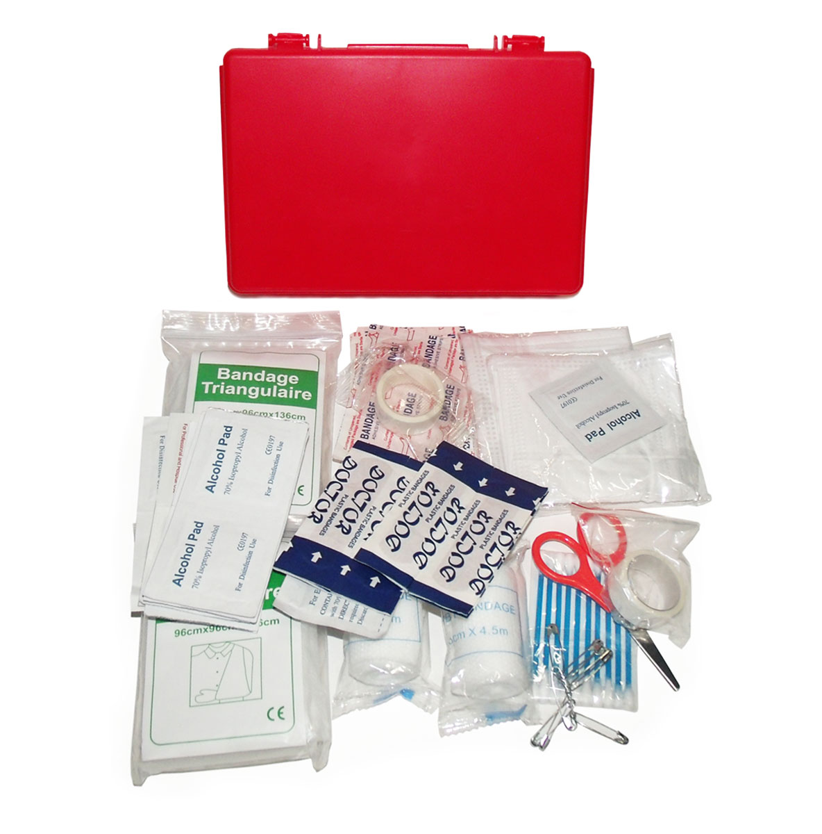 This emergency first aid box contains twenty pieces of 5/8” x 2 3/4" band-aids, ten pieces of 2" x 3" adhesive strip bandage, twenty alcohol pads, ten safety pins, ten iodine volts rods, two tissue tapes, one 5cm x 4.5m bandage, one 7.5cm x 4.5m bandage, two non- woven triangle cloths, one scissor, and two disposable face masks. It's made of ABS plastic material and measuring 7.25 (W) x 5 (H) x 2.16 (D) inches in size.