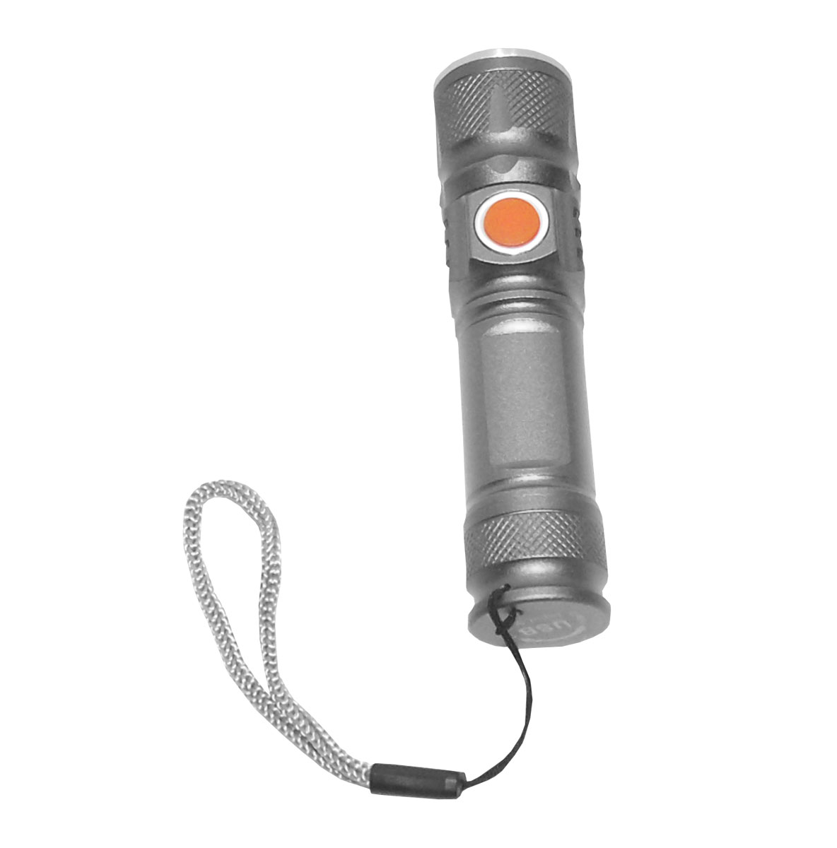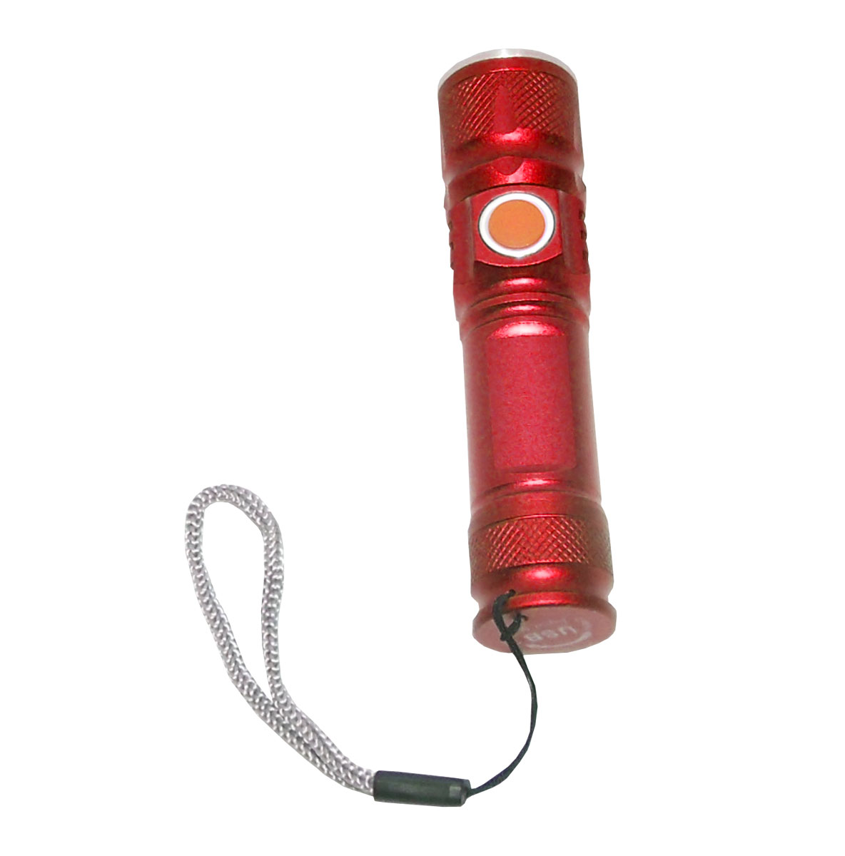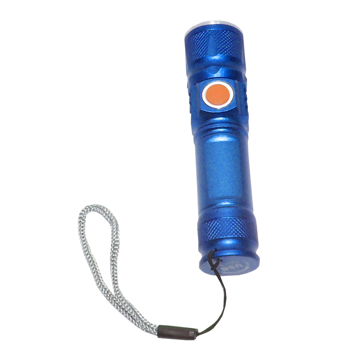 Emergency Rechargeable Torch Flashlight. Made of Aluminum Alloy material, measuring 4.37 (L) x 0.98 (D) inches in size. Featuring built-in USB rechargeable battery with zoomable adjustable focus. This high-quality flashlight is weather and shock- resistant. It makes a great promotional gift idea and also ideal use for emergencies, camping, outdoor activities, etc.